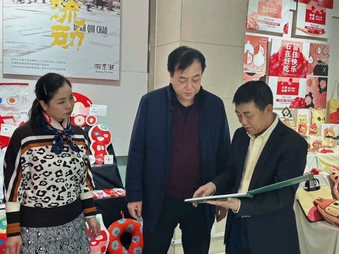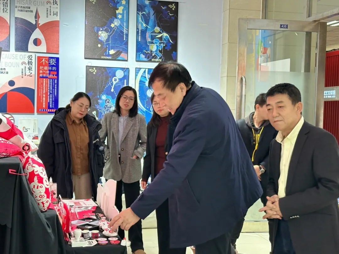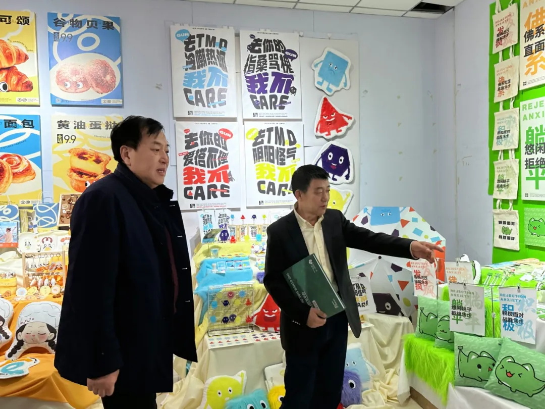在视觉传达设计专业展区,张校长认真聆听专业主任对每一组品牌形象设计作品的讲解并详细询问学生在创意构思与设计执行过程中的思考与突破,他对学生作品中展现出的市场需求与设计美学的融合表示肯定。
