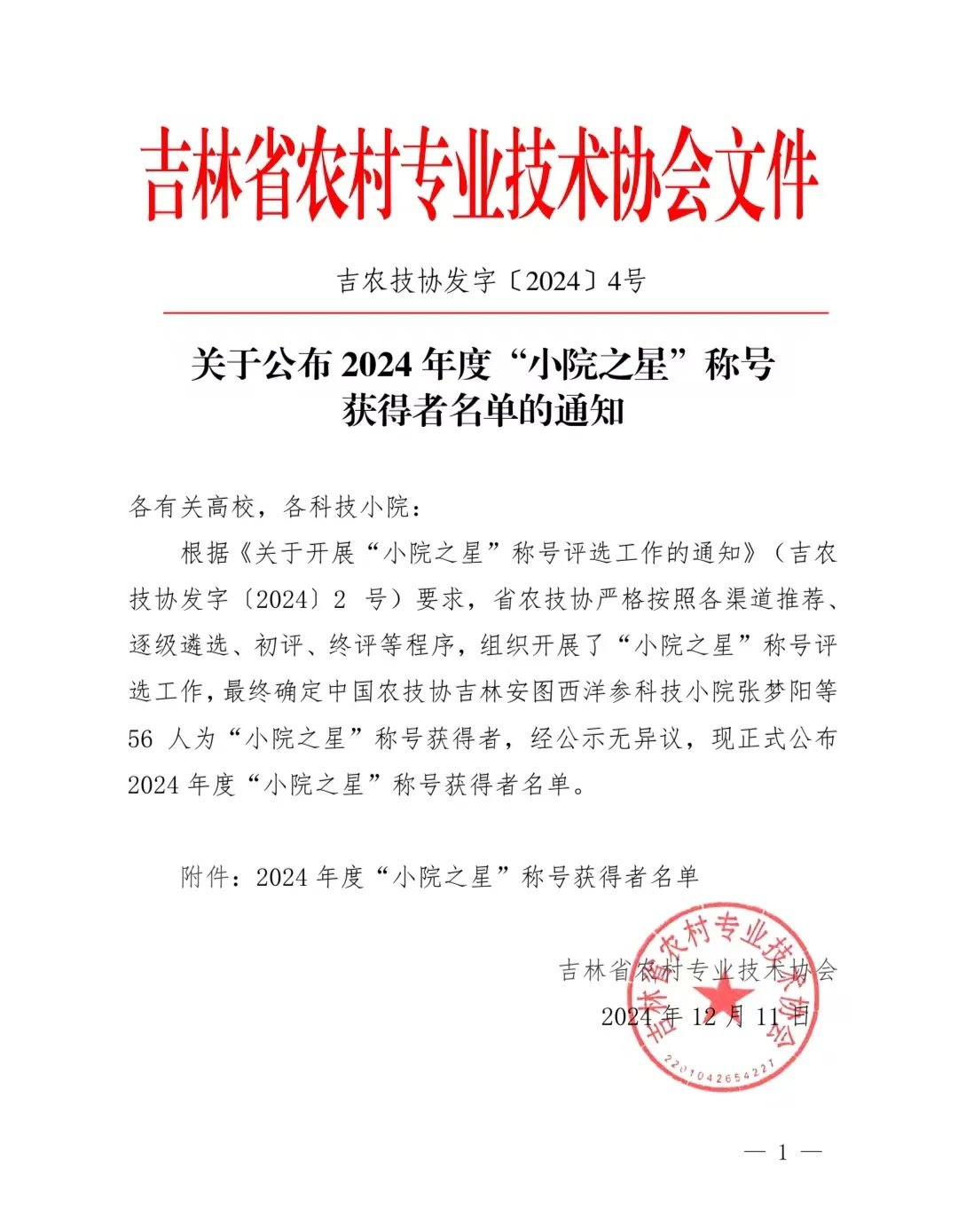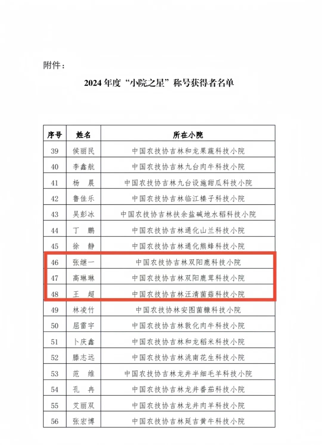 根据《关于开展“小院之星”称号评选工作的通知》(吉农技协发字〔2024〕2 号)要求,省农技协严格按照各渠道推荐、逐级遴选、初评、终评等程序,组织开展了“小院之星”称号评选工作,最终确定中国农技协吉林安图西洋参科技小院张梦阳等56人为“小院之星”称号获得者,我校中国农技协吉林双阳鹿科技小院张继一、中国农技协吉林双阳鹿茸科技小院高琳琳、中国农技协吉林汪清菌菇科技小院王超,获评为2024年度“小院之星”,这是我校依托科技小院,提升人才培养质量,增强服务地方经济社会发展的又一重要成果。