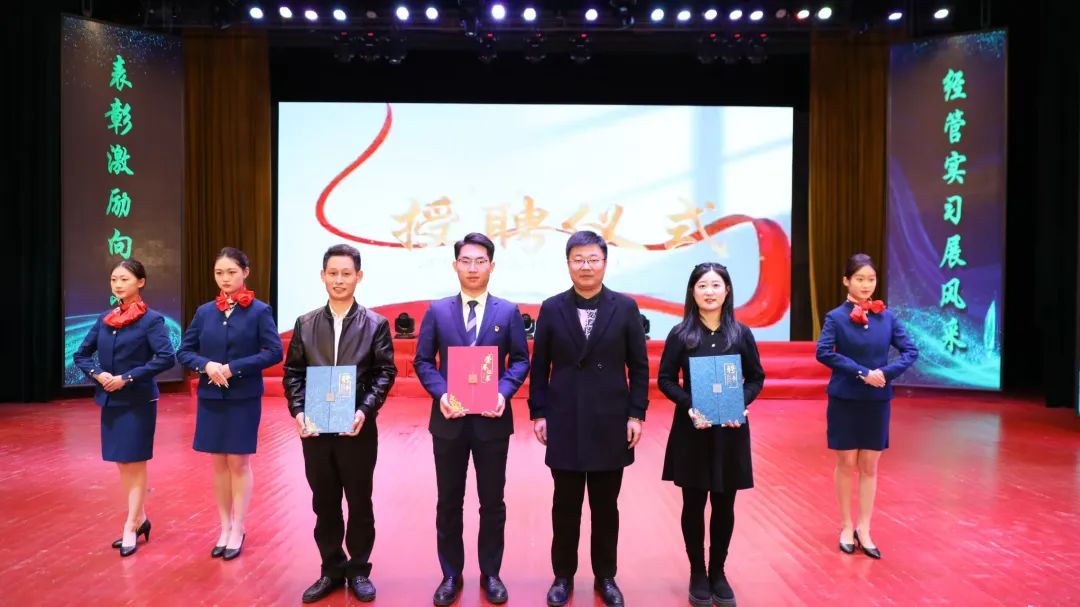 在受聘仪式上,副书记武强宣读《关于聘任校外实习管理辅导员的决定》和《表彰实习管理优秀辅导员的决定》,产教融合发展委员会主任孙大伟为校内外辅导员颁发证书和聘书。