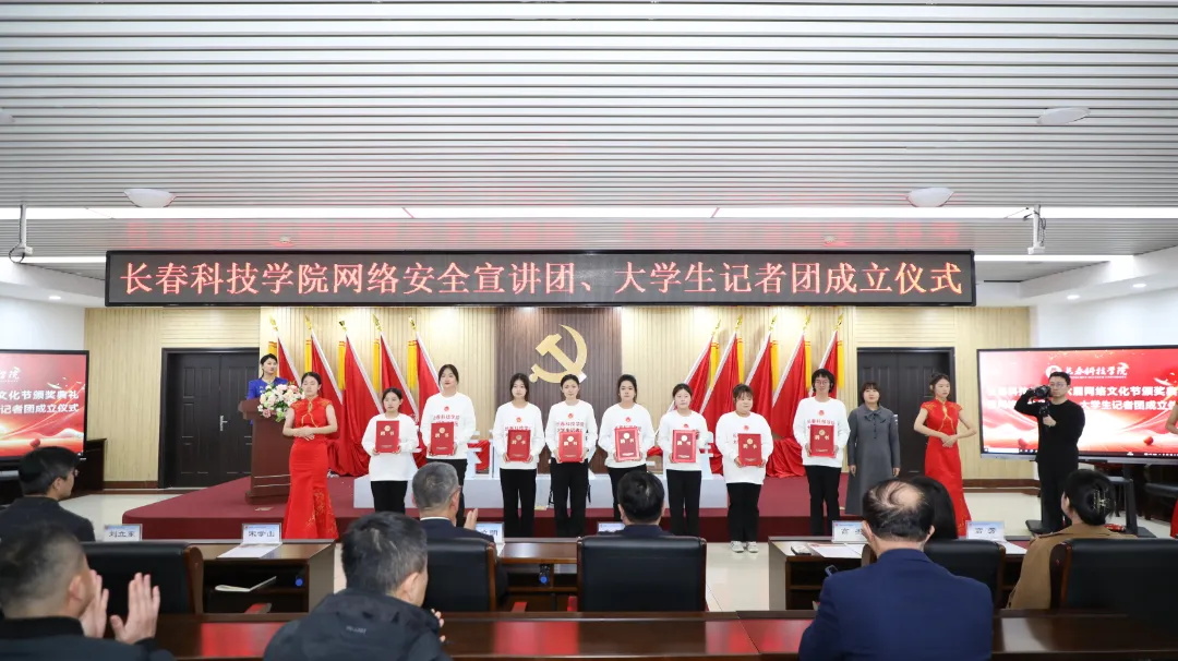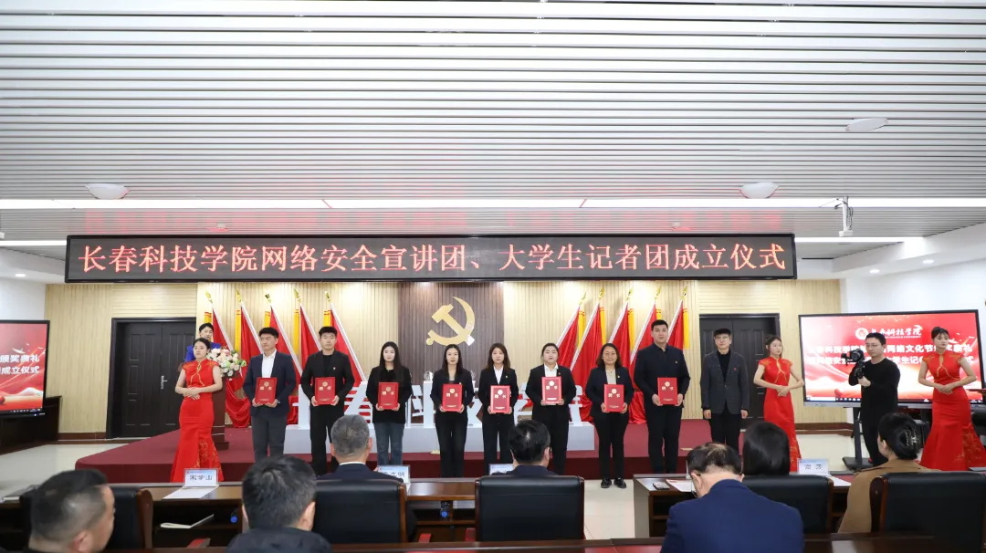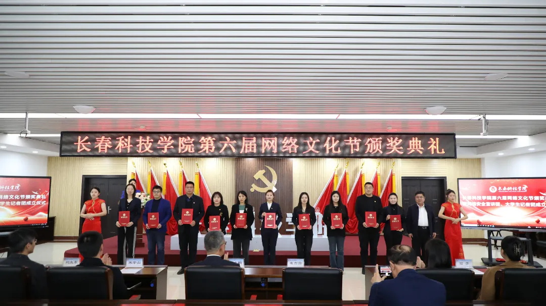 荣耀颁奖,盛启新篇。12月9日,长春科技学院第六届网络文化节颁奖典礼暨网络安全宣讲团、大学生记者团聘任仪式在行政楼409会议室举办。长春科技学院校长栾立明,党委书记崔高嵩,党委副书记宋学山,副校长高杰,校长助理刘立东,党委副书记高芳,党委常委、党政办公室主任孙大伟,团委书记孙旭出席典礼。学校各单位主管宣传工作的领导、通讯员、网络安全宣讲团、大学生记者团成员及各分院优秀学生记者代表参加活动。