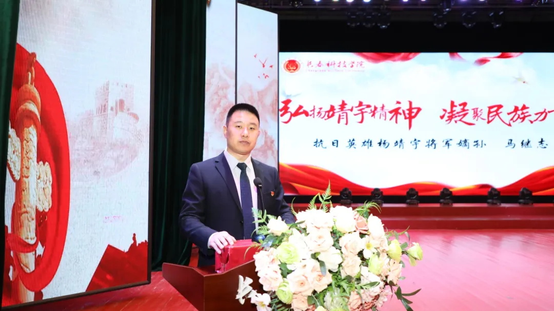 随后,马继志老师以“弘扬靖宇精神,凝聚民族力量”为主题,为在场师生作了一场深刻而生动的报告。他详细讲述了杨靖宇将军的生平事迹,展现了那段艰苦卓绝的革命和抗战岁月。杨靖宇将军青少年时期就开始探索追寻革命道路,大革命时期领导农民革命运动,受党指派来到东北从事工人运动,组建东北抗日联军并英勇作战,直至壮烈牺牲,其大无畏精神深深触动了在场每个人的心。