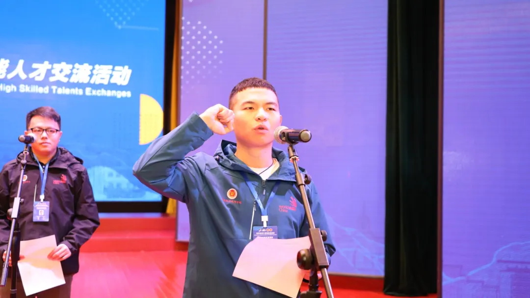 裁判员代表中国澳门卢德诚、选手代表中国樊孟强分别宣誓后,张电达宣布世界技能大赛国际邀请赛暨高技能人才交流活动开幕!