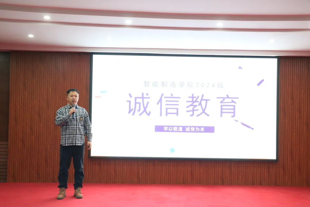 为培育良好学风,塑造严谨考风,营造公平公正的考试环境,智能制造学院24级辅导员张健老师为机械设计制造及其自动化、机器人工程、电子信息科学与技术、自动化、新能源汽车工程的同学们召开了诚信考试教育大会。