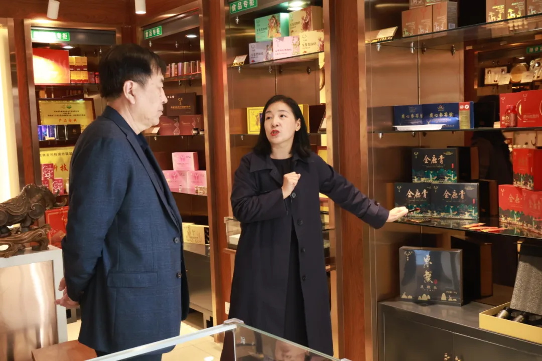 首先由东鳌鹿业集团总经理徐慧带领梅花鹿产业学院专家团参观企业产品展厅,并为其介绍集团各类精深加工鹿产品(包括人参鹿鞭片、鹿血肽冻干粉片、鹿酒系列、鹿胶肽粉、全鹿膏等)的原料、生产工艺和滋补功效。随后,一行人换好洁净服,参观前提取车间、食品车间、酒剂车间、保健品车间和产品检测中心。