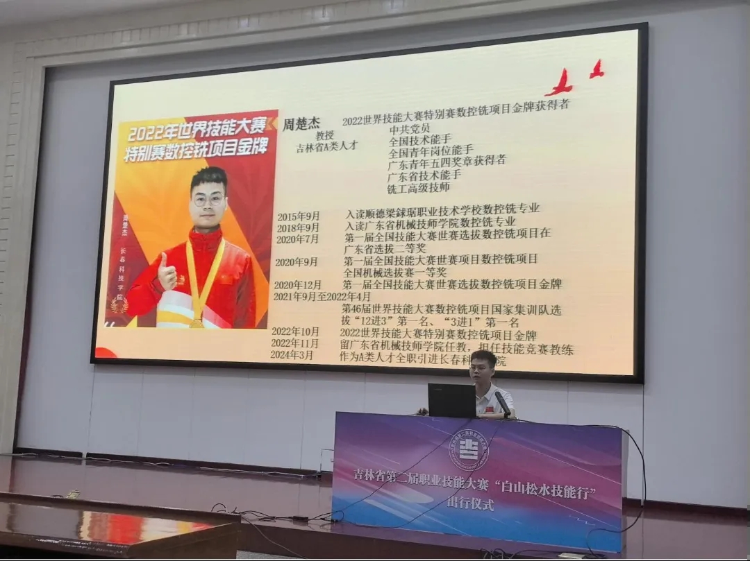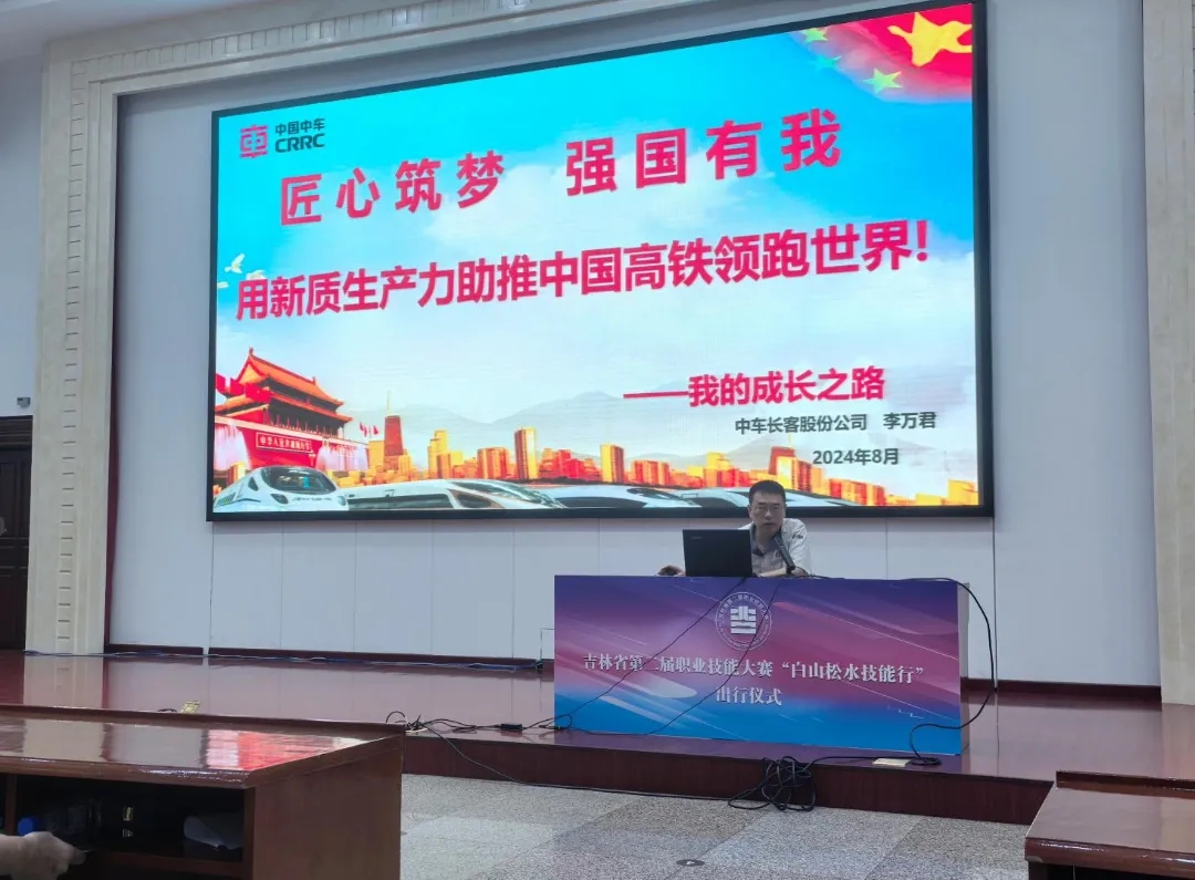 出行仪式结束后,2024 年 “白山松水技能行” 首场报告会精彩上演。中华技能大奖获得者、感动中国十大人物、全国首批 “大国工匠”,代表中国轨道车辆转向架构架焊接技术世界最高水平的长春科技学院特聘教授李万君大师,世界技能大赛数控铣项目金牌获得者、“全国技术能手”,长春科技学院机械技能开发研究室主任周楚杰作了首场报告。