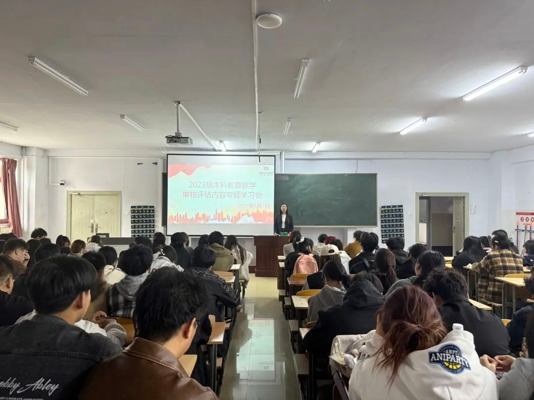 为扎实推进本科教育教学审核评估迎评工作,加深学生对审核评估内涵的理解,2025年5月7日中午11:30,视觉艺术学院在三教开展2023级本科教育教学审核评估内容专题学习会,会议由23级辅导员朱羽琪老师主持,2023级全体学生参加此次会议。