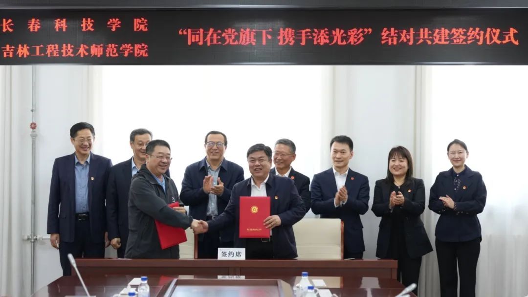 5月19日下午,我校与吉林工程技术师范学院举行“同在党旗下 携手添光彩” 结对共建签约仪式。校长栾立明、党委书记崔高嵩与吉林工程技术师范学院党委书记刘剑桥、校长杨晓东等双方校领导及相关部门教师参加会议。此次活动旨在以党建为引领,深化校际合作,推动双方在党建、教育教学、人才培养等领域实现资源共享、优势互补,共同书写高等教育事业发展新篇章。