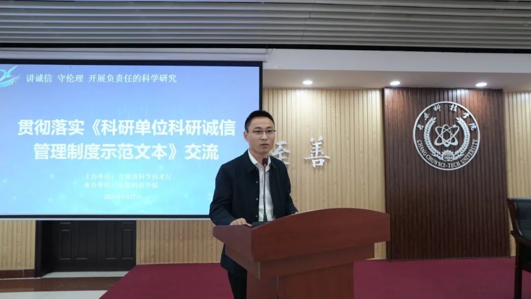 近年来,党中央高度重视科研诚信体系建设。习近平总书记在2024年全国科技大会、国家科学技术奖励大会、两院院士大会上明确指出,要加强科研诚信和作风学风建设,推动形成风清气正的科研生态。为贯彻党中央相关精神和部署,推动科研诚信理念,5月27日,由吉林省科学技术厅主办,长春科技学院承办的“讲诚信 守伦理 开展负责任的科学研究”系列宣讲活动在行政楼411会议室成功举办。省科技厅监督评估与科研诚信处处长唐喆、中国科学院长春光机所监督与审计处副处长程博、省科技厅监督评估与科研诚信处陈菲以及学校师生代表320余人参加活动。活动由科研处处长、学科建设办公室主任陈前主持。