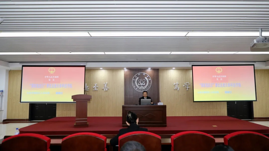 在“宪法宣传周”到来之际,长春科技学院积极响应国家法治宣传的号召,邀请长春市朝阳人民法院湖西法庭庭长曹春江走进学校,为广大师生进行普法讲座。党委副书记高芳及各单位主管网络安全领导、网络管理员、网络安全宣讲师、通讯员,全体辅导员和优秀师生代表总计300余人现场聆听报告。